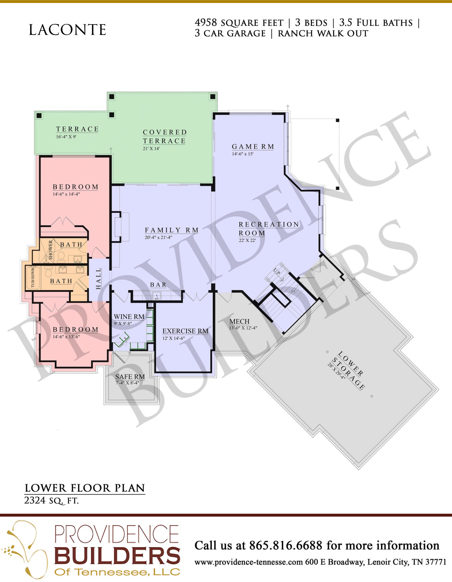 Type: Ranch Walkout, 4958 Square Feet, 3 Bedrooms, 3 Full Bathrooms, 1 Half Bathroom, 3-Car Garage.