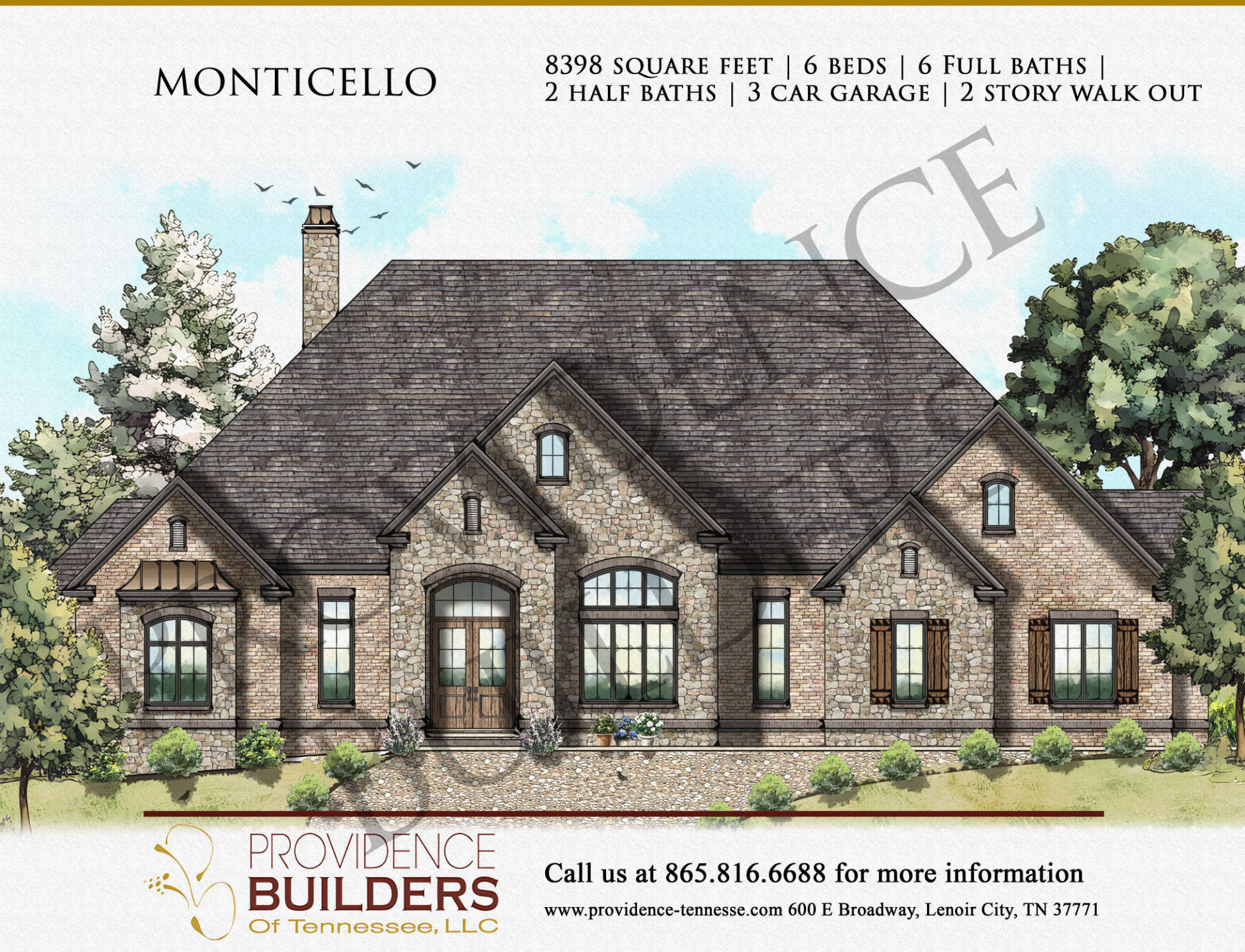 Type: 2-Story Walkout, 8398 Square Feet, 6 Bedrooms, 6 Full Bathrooms, 2 Half Bathrooms, 3-Car Garage.